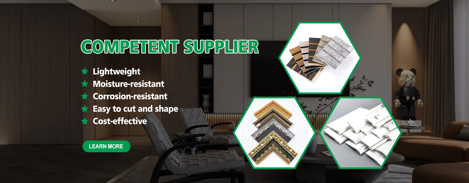 The company is committed to selling indoor and outdoor decoration building materials, including PS frame, PVC marble sheet, Embossed PVC sheet, PS wall panel, WPC wall panel, PU stone, acoustic panel, PVC wall panel etc.